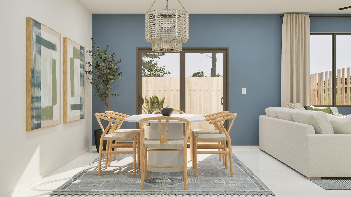 Spanning 1,615 square feet, the Eclipse features three bedrooms, two full bathrooms, and one half-bathroom, providing ample space for families of all sizes. Upon entering, guests are welcomed into a formal living room, perfect for entertaining or relaxing in a sophisticated setting. Moving toward the back of the home, the open-concept main area seamlessly integrates the kitchen, dining room, and family room, creating a warm and inviting space for daily living and social gatherings. A rear patio extends this entertaining space outdoors, offering a private retreat for morning coffee, evening relaxation, or weekend barbecues.